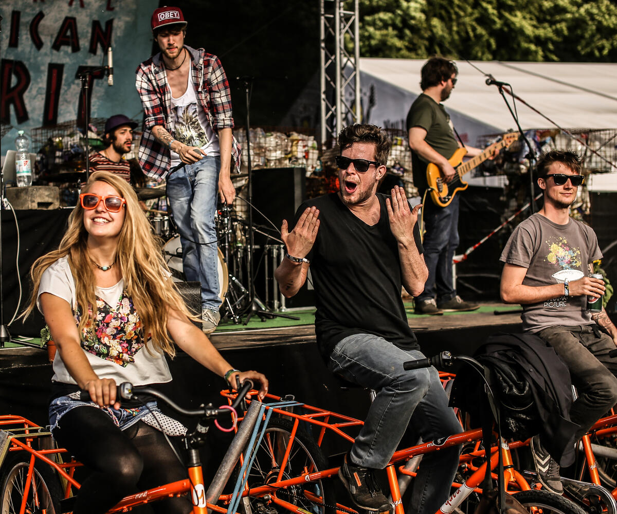 - 10 Fahrräder versorgen die Beschallung von 2 x Fullrange-Lautsprecherboxen sowie 2 Bassboxen á 1,5 kW und eine kleine Backline (Singer/Songwriter/Unplugged-Show oder DJ Set zzgl. kleine Backline)