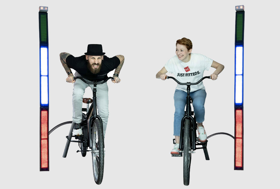 Beim Pedalometer Deluxe geht es ums Kräftemessen auf Zeit: auf zwei Fahrrädern treten Teilnehmer im Wettstreit gegeneinander an. Je mehr gestrampelt wird, desto mehr Leuchtstufen erscheinen auf der drei Meter hohen LED-Säule. Wer als Erste*r den Energie-Peak nach der letzten Leuchtstufe erreicht, hat gewonnen.